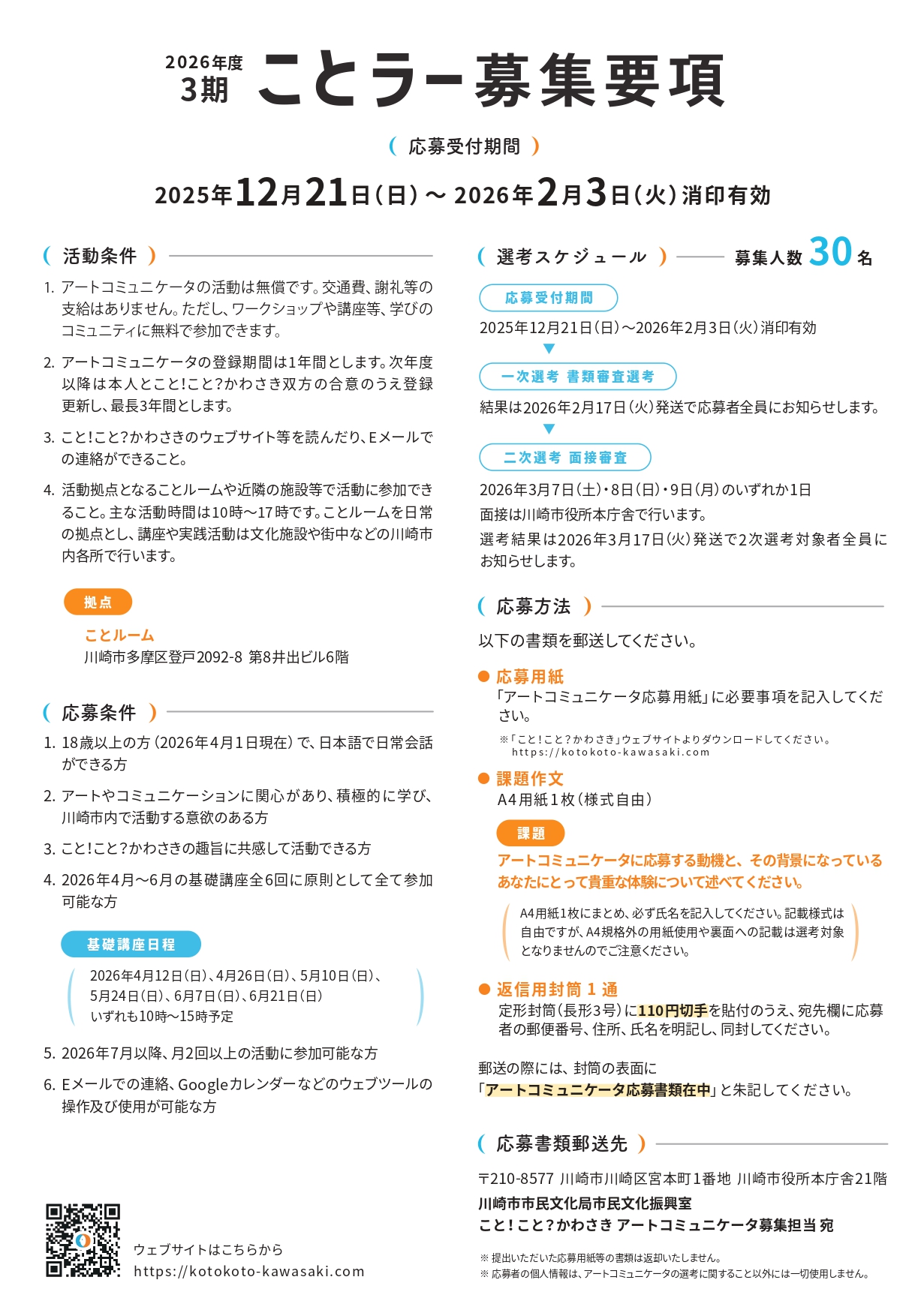 ・活動拠点となることルームや近隣の施設等で活動に参加できること。主な活動時間は10時〜17時です。ことルームを日常の拠点とし、講座や実践活動は文化施設や街中などの川崎市内各所で行います。